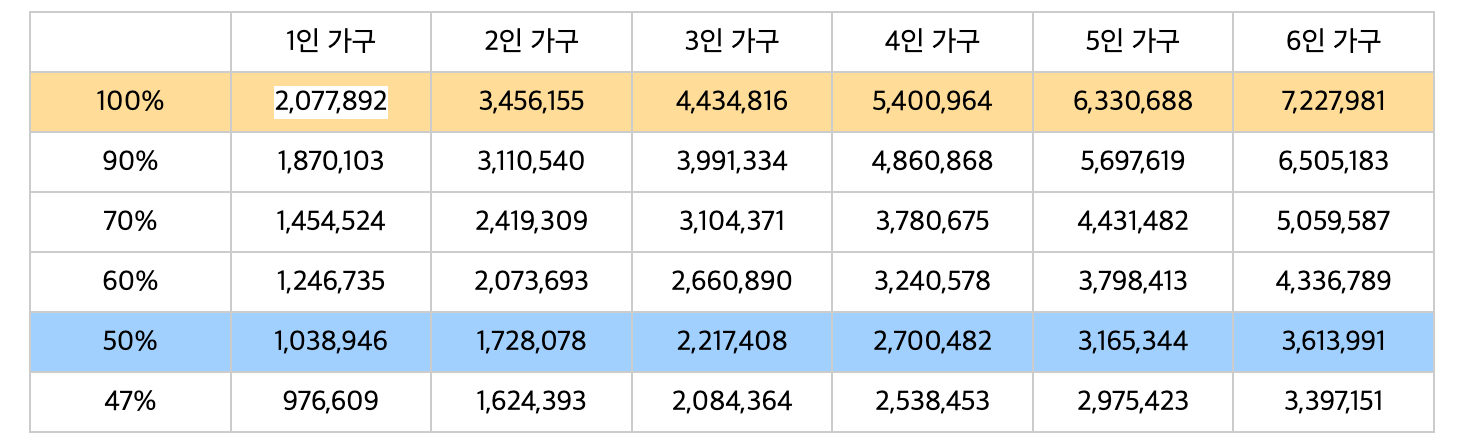 - (가구소득) 소득인정액 기준 중위소득 100% 이하